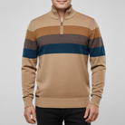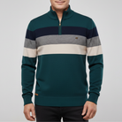 Ein klar strukturierter Pullover mit modernem Streifendessin, das eine markante, aber ausgewogene Optik schafft. Der Stehkragen mit kurzem Reißverschluss betont die aufrechte Silhouette und verleiht dem Look eine dezente Dynamik. Ideal für gepflegte Freizeitmomente oder lässige Kombinationen mit Hemd und Jacke.